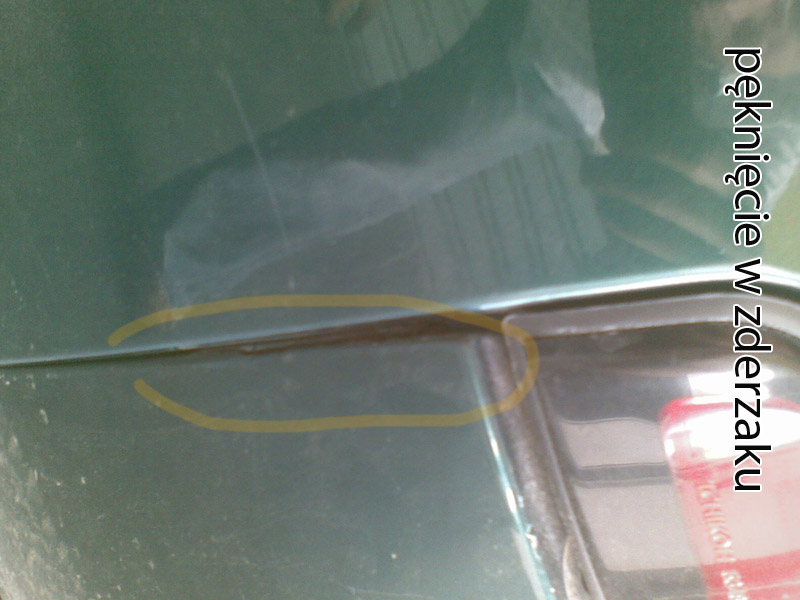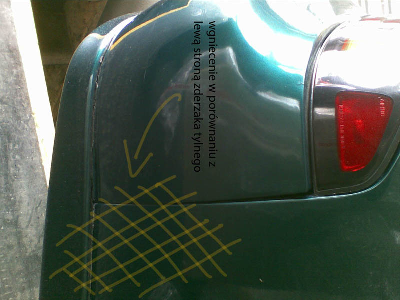2. uderzenie w tył z prawej strony, jakby od dołu, po odsłonięciu dywanika w bagażniku widać że karoseria pod zderzakiem była naprawiana. Po lewej stronie tylnego zderzaka widać pęknięcie lakieru na samym obrzeżu zdj 2a. na zdj 2b zakreskowałem część zderzaka która jest zapadnięta. zdj 2c uszkodzona lampa. Sprzedawca fiata zwierzył się że auto miało niewielką stłuczkę na autostradzie.