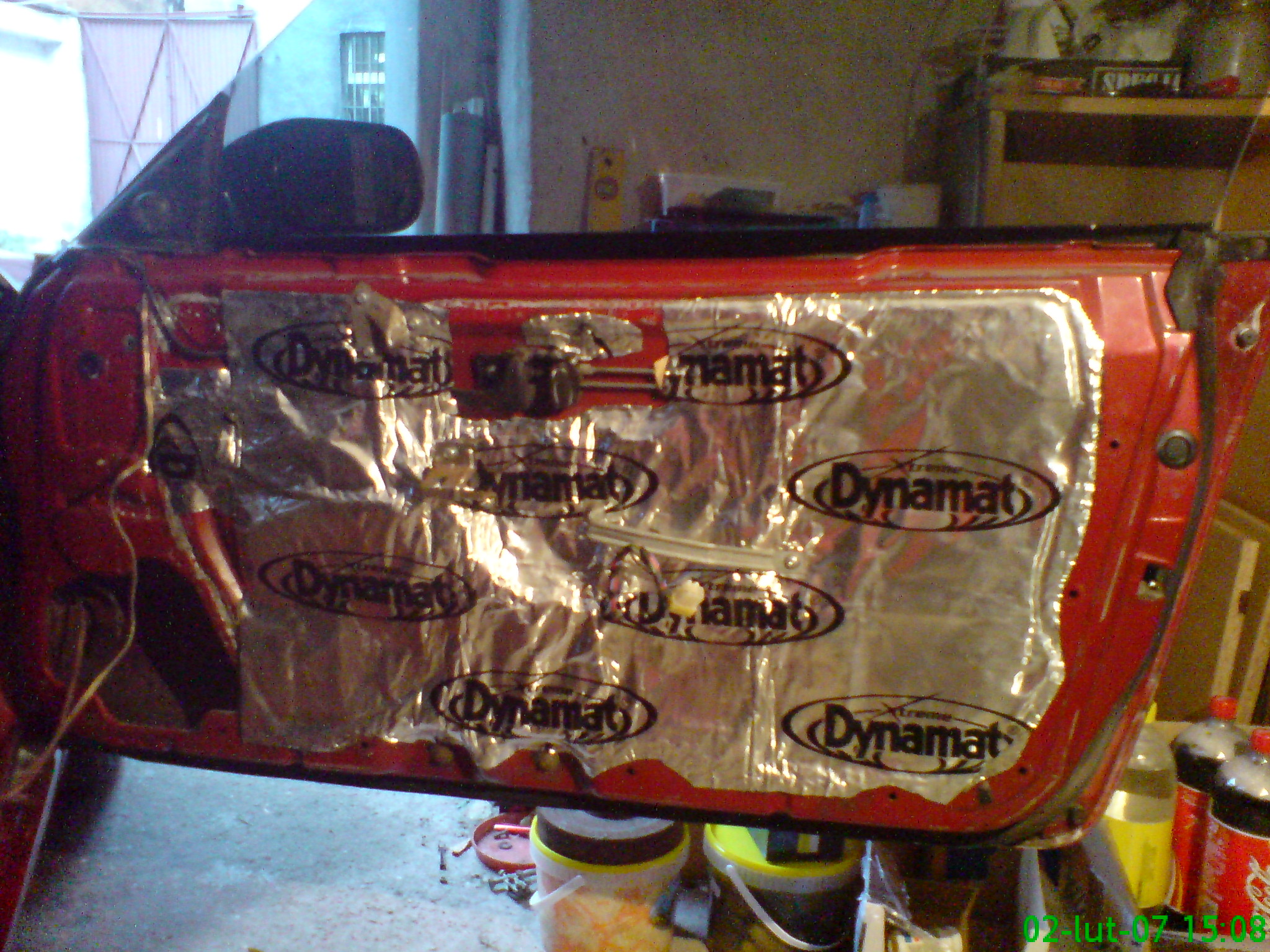 Dynamat ma tą zalete ze w kazdej temperaturze zachowuje sie tak samo ( bo to aluminium ) , bardzo latwo i szybko sie naklada , demontaz przypuszczam tez jest bardzo latwy i szybki. Jedna mata wazy niewiele , na oko max 1kg i na podstawowe wygluszenie wystarcza. Ja wytlumilem tylko tak jak na zdjeciu , nie oklejalem ani plata zewnętrznego , ani tapicerki. Przy moim audio to by bylo niepotrzebne. Najwazniejsze to zakleic wszystkie otwory w drzwiach przez ktore glosnik dmucha w tapicerke powodując jej drgania. Dalsze wytlumianie to juz naprawde do profi sprzetu i profi ucha :) W jadącym aucie to i tak bez sensu bo halas zewnetrzny popsuje caly nasz wysilek i pochłoniętą kase.