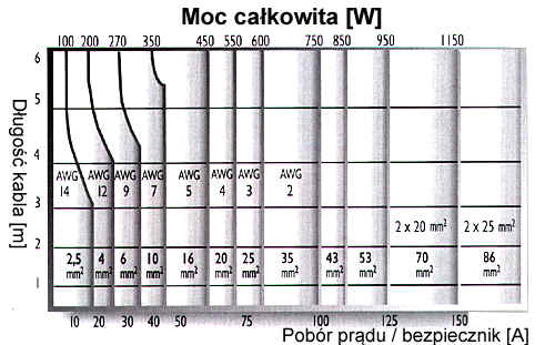A tutaj tabelka pokazujaca zalecane przekroje kabli w uzaleznieniu od pradu i dlugosci przewodu.