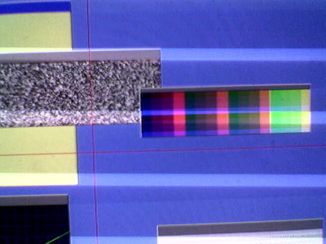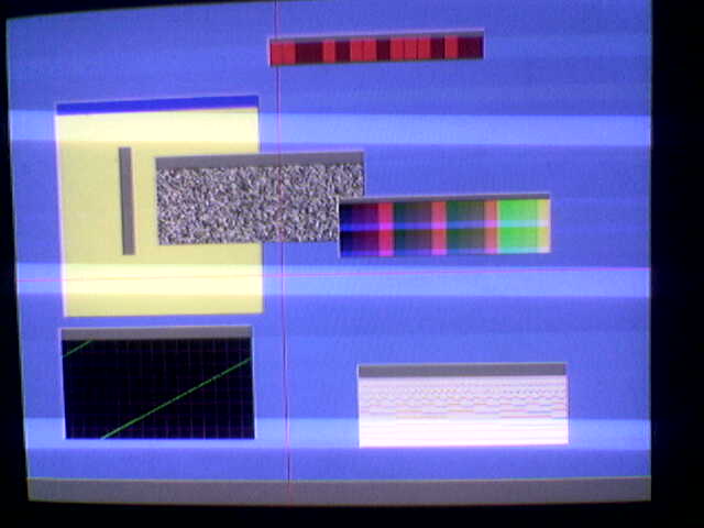 Oraz druga czesc zdjec dla tych co chcieli bajery w stylu wyswietlacza, narazie zaimplementowane jest wyjscie VGA - jednak obecnie duza czesc malych telewizorkow LCD ma cos takiego. Ewentualnie mozna pomyslec nad wyjsciem PAL, jednak nie wiem jak wyjdzie z jakoscia obrazu. Narazie maly przyklad mozliwosci graficznych (tak na szybkiego) - jak sie by czlowiek uparl to mozna zrobic troche ladniej (zdjecia monitora wiec jakosc tez taka sobie).